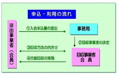 オフィス町内会は、排出事業者会員と回収事業者会員とで構成され、回収事業者が会員のもとへ回収便を運行して古紙を回収し、回収した古紙は製紙会社に搬入され、製紙会社においてリサイクルされます。