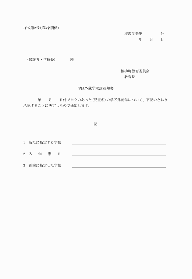 2 施行令第五条第二項による学校の指定は、板柳町住民基本台帳に基づき、保護者(子女に対して親権を行う者。親権を行う者のないときは、未成年者後見人をいう。以下同じ。)の住所によって行う。ただし、施行令第八条の規定に基づき、別表第二に定める基準に相当する理由があると認められるときは、他の学区とすることができる。